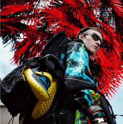 Plastic Island- A new approach to sporty dressing combines heightened awareness of sustainability with the humid neon glow of tropical urban nights. Easy summer staples such as tees and board shorts are mixed and layered with more technical sports items, which use recycled materials for an unashamedly synthetic look.