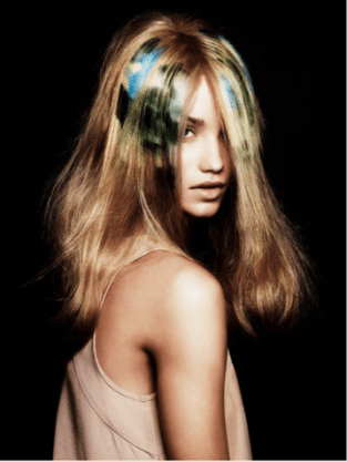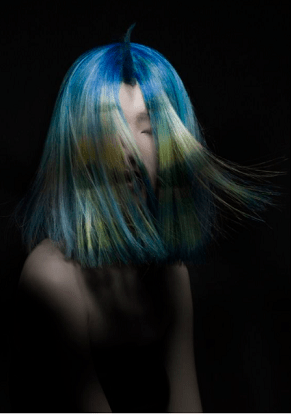 Deep, tropical tones of blue and green have an artificial quality, and are layered and placed haphazardly in different sections. Color is applied in a halo shape around the top or painted in a patchwork technique around the front of the head.