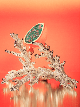 Hyper Nature- Exaggerated surfaces create a hyper-natural, super tactile direction. Virtual texture is explored through computer renders, and physical products feature surreal three-dimensional skins with densely encrusted beaded textures, using recycled plastic and recycled glass from the sea.